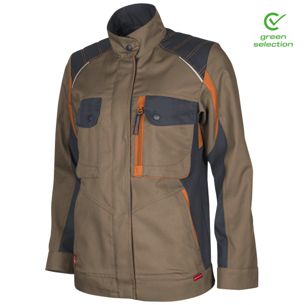 • 2 Brusttaschen (Blasebalg) mit Patte und Druckknöpfen, links + Reißverschluss-Tasche + Ausweisschlaufe